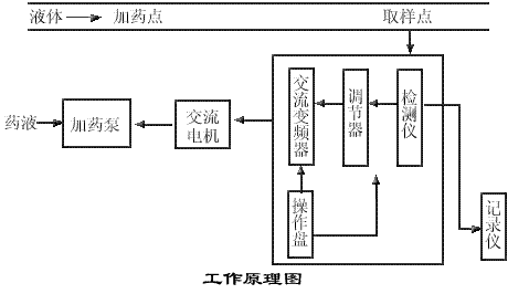 加藥泵電機在交流變頻器驅(qū)動下,將藥劑注入到液體中,藥濃度被檢測儀檢測,檢測儀將與濃度成比例的電信號輸入到調(diào)節(jié)器與設(shè)定值比較,得到偏差信號,調(diào)節(jié)器將偏差信號按工藝要求進行比例、積分運算,其運算結(jié)果信號輸送給變頻器,變頻器按調(diào)節(jié)器輸出的調(diào)節(jié)信號改變電機工作電源的頻率,使電機轉(zhuǎn)速發(fā)生變化,改變注入液體中藥液濃度,使藥劑濃度控制在要求范圍內(nèi)。